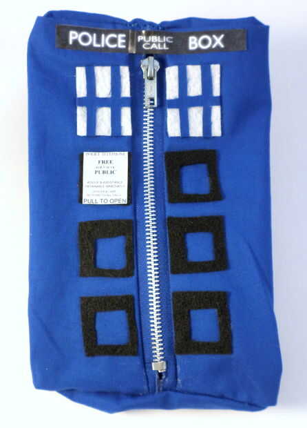 Utilizar a la tela pegamento a la "policía pública llamada caja del pegamento" en la parte delantera de la Tardis, centrado en la parte superior derecha entre la costura y el inicio de la parte metálica de la cremallera. Uso tela pegamento de cola muestra el panel de la puerta en el panel de la puerta intacta hace.