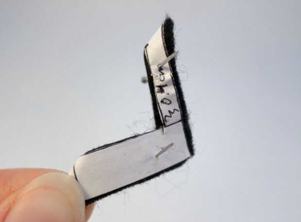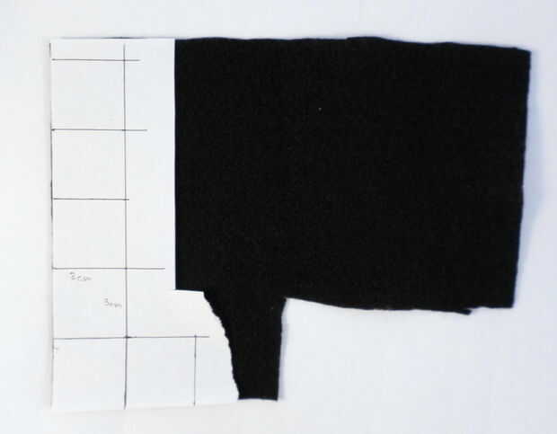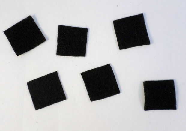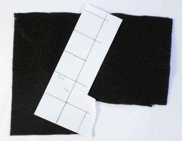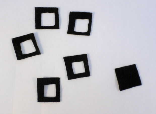 Usted querrá cortar seis paneles de fieltro negro. Cada panel debe ser un 3 cm cuadrados de 3 cm. Para hacer esto, saqué 6 cm 3 por cuadrados de 3 cm en una hoja de papel, clavijas de empuje usada para sujetar el papel al negro sentía y luego recorto.