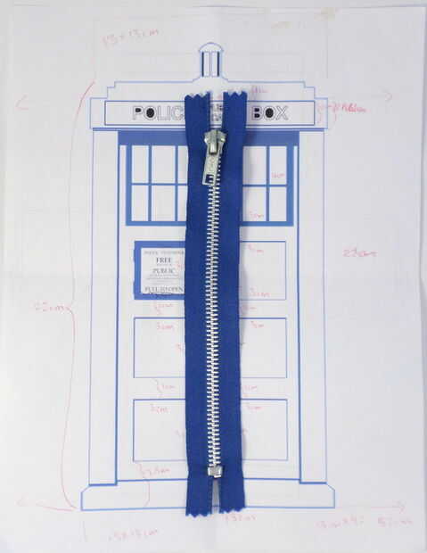 ), descargado y luego utiliza un programa de retoque fotográfico para hacerlo imprimir en la escala derecha como mi Tardis. Esto significa que la apertura de la puerta debe tener la misma altura que la longitud de la parte metálica de mi cremallera azul. La primera foto de este paso muestra el print-out con dimensión el espaciamiento de las medidas de cada parte diferente, creo que esto es muy útil para averiguar cuánto hacer todo y su espacio una de otra. La segunda imagen muestra la impresión hacia fuera con la cremallera en la parte superior, mostrando que la apertura de la puerta es la misma altura que la longitud de la cremallera.