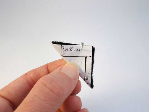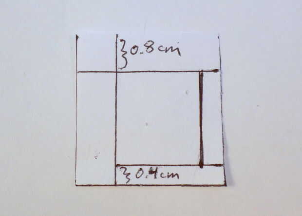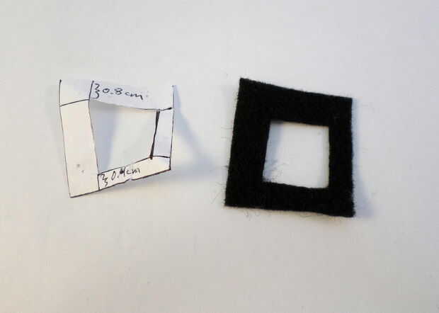 A continuación, recortar parte del interior de cada cuadrado para que las plazas se vean como los bordes de los paneles de puerta. Para tener un efecto de sombreado, hice dos bordes adyacentes de las plazas ser 0,8 cm de espesor y los otros dos bordes adyacentes por 0,4 cm de espesor. Ver las fotos para más detalles. La forma más fácil de cortar esta parte es dibujar en papel (en uno de los cuadrados de papel de corte tienes ahora), ponerlo encima de un cuadrado de fieltro negro, pliegue ambos juntos diagonalmente (mediante clavijas de empuje) y luego corte a lo largo de la parte interior las líneas.