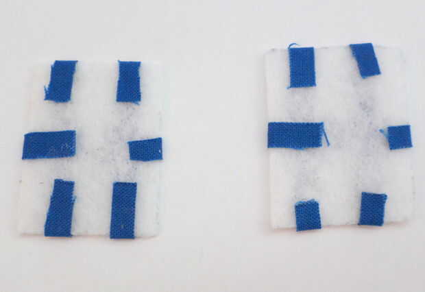Una vez que las partes blancas y bandas azules para las ventanas son corte hacia fuera, pegue las bandas azules en las partes blancas usando el pegamento de tela. Envuelva las tiras de banda extra azul alrededor de las espaldas de las partes blancas y les pegue demasiado. Ver las fotos. (Cuando se utiliza el pegamento para tela, usted querrá colocar un objeto plano y pesado en las piezas pega y que pegamento para un par de horas.)