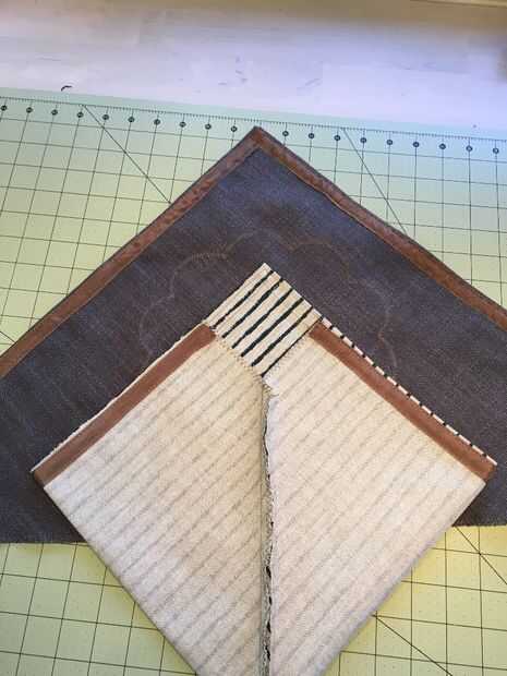 Doblar las piezas por lo que la parte inferior parecen líneas arriba en el centro (ver foto) y coser las esquinas juntas (aproximadamente tres pulgadas desde el punto). La almohadilla de corte en la foto da una mejor idea de las dimensiones.