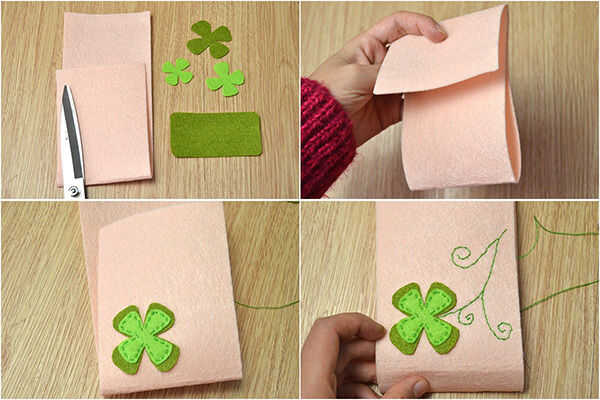 3 º, se superponen un trébol de color verde lima en verde y los ponen en el beige en la esquina inferior izquierda de la parte delantera. Puntada corriente a lo largo del borde del trébol del verde lima;