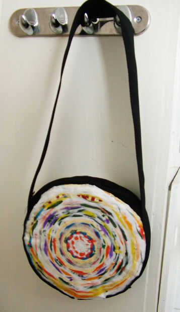 esta bolsa está hecha en agujas circulares del tamaño 10 1/2 (24 pulgadas). usé lana de los patons real púrpura con rayas de twister de los patons. también puede utilizar hilado de la novedad en el cuerpo del bolso entero, no sólo rayas. se trata de