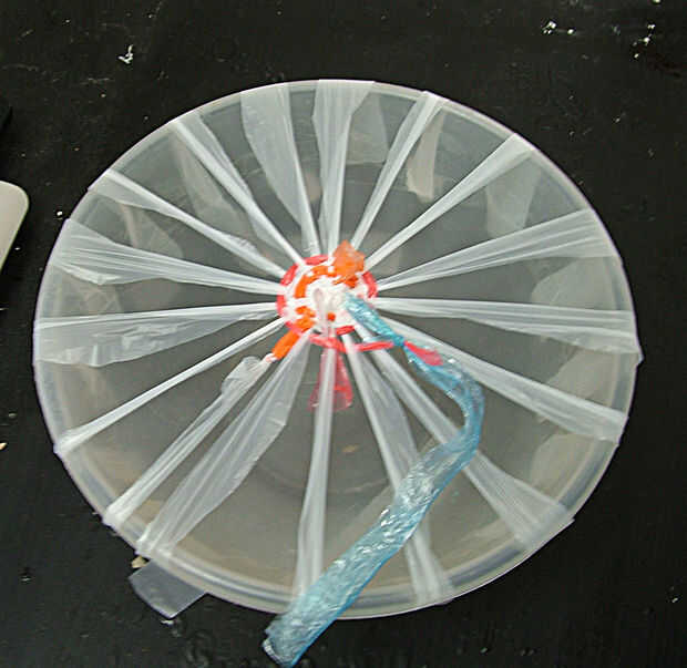 Tomar un tazón de fuente grande y pegar el plástico rayas corte a los bordes del tazón de fuente en forma circular. Asegúrese de que añadir una tira adicional para que sea desigual en número la cantidad de tiras esto para mantener el tejido funciona correctamente.