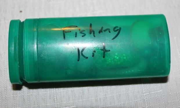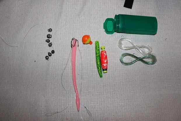 Kit de la pesca - Split tiro pesos, prueba de 10 lb de 50 pies, 50 pies 14 lb prueba, 2 bobbers, líderes, 4 ganchos y 2 gusanos artificiales (1 se utiliza para almacenar los ganchos para evitar que accidentalmente quedar atascado por uno)