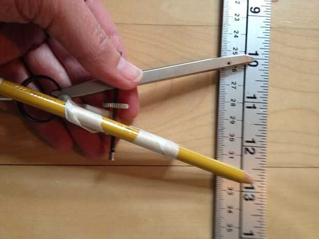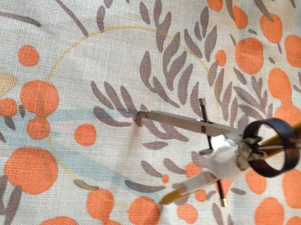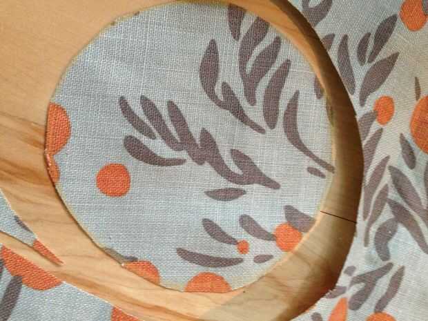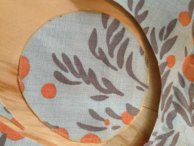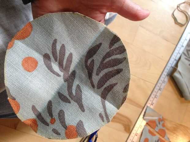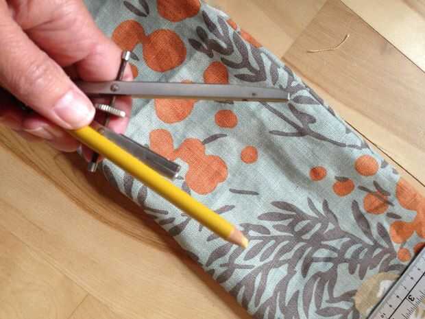 Usando un compás y un lápiz de tiza (yo usé cinta adhesiva para sujetar el lápiz) y su anchura de compás a su radio, en mi caso 2 3/4" y dibuja un círculo sobre la tela.