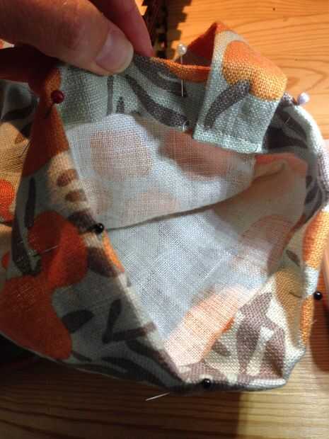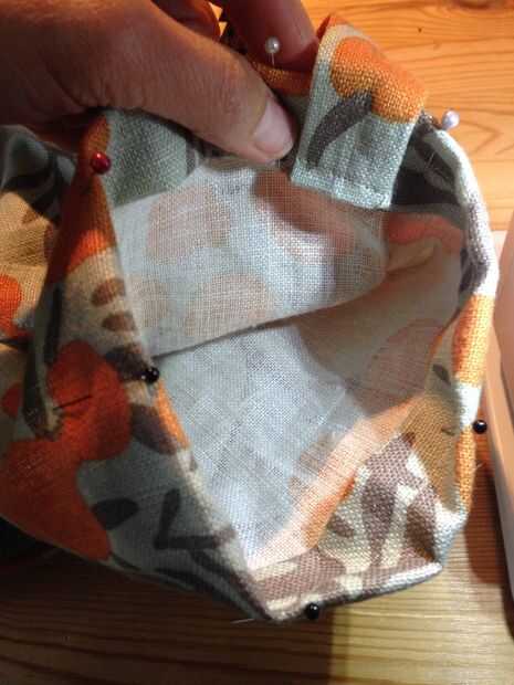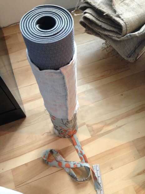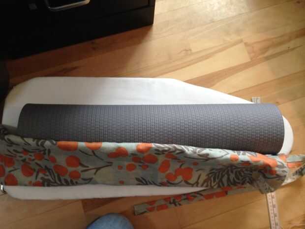 Luego necesitas averiguar la longitud de la correa. Es una buena idea su estera y poner en la bolsa, y coloque la correa con alfileres para ver cómo se siente (deje un poco suelta). Cortar la correa, quitar su estera y prender su correa al borde de la bolsa, haciendo coincidir el borde del bolso y el extremo de la correa con las costuras uno frente al otro (ver foto). Coser la correa al bolso con un margen de costura de 1/4".