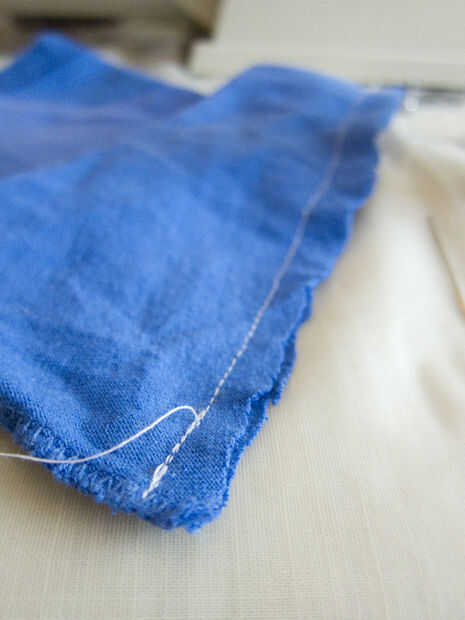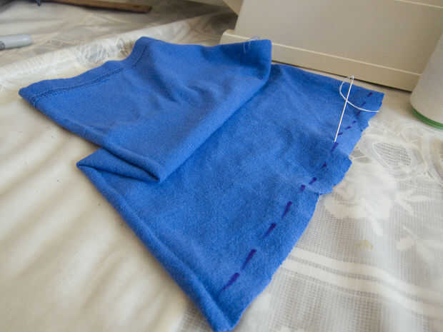 Tirón del manga al revés antes de coser. Yo he marcado la línea que quería coser a lo largo, pero puedes seguir adelante y coser sin él. Empecé con mi máquina de coser y utiliza el ajuste de puntada recta, pero si fueras a coser a mano, creo que un pespuntes sería lo más ideal. Echa un vistazo a esta referencia para la instrucción de coser de mano.