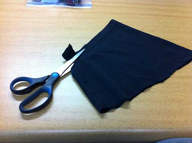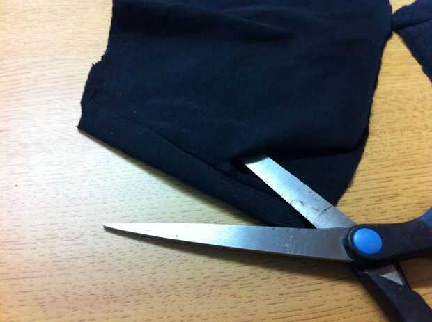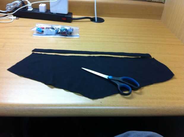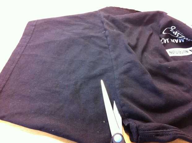 Ahora retire la funda del resto de la camisa, y lomo en una pieza plana de la tela. Usted puede tirar la costura original, pero mantener el dobladillo de la camiseta. Vamos a utilizar esto como el lazo de la real.