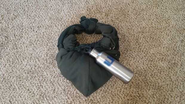 Si tienes cordones puede ceñir hasta y atarlos juntos en toda la nuca del cuello del suéter para una configuración más segura, si no se puede ir derecho a atar las mangas para hacer la correa de hombro. Va a ser un ajuste ceñido pero que lo ayuda a permanecer en el lugar que es bonito para el cruce de terreno accidentado. Si es demasiado apretado puede necesitar un suéter más grande. También, si tienes cordones puede atar una botella de agua o más nada realmente que pueden quieren/necesitan ser fácilmente disponibles. Ahora estás listo para ir con todas sus cosas a cuestas!