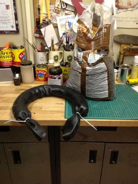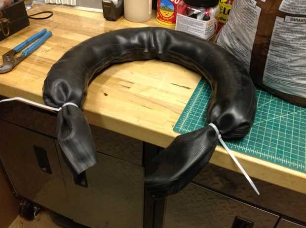 Llenar el extremo abierto con pajote de goma usando una taza de café o tipo de escote. Este se paso a la parte más difícil, porque tardará algo de tiempo y esfuerzo para conseguir el acolchado relleno hacia abajo el tubo interior y lleno. Esto me llevó veinte minutos en llegar justo por debajo de 10 libras de relleno.