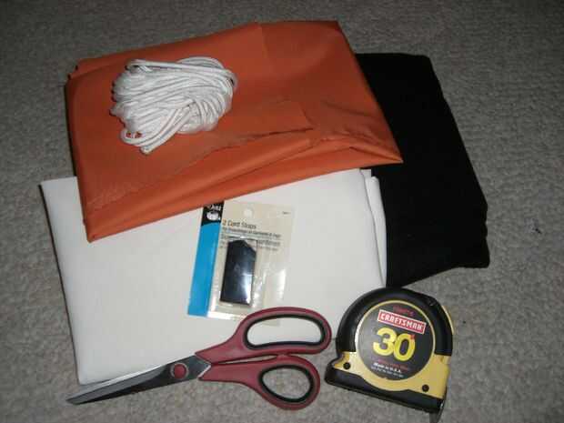 Se utilizaron tres tipos de material, lana negra, Nylon blanco y fieltro como/nylon apoyaron pieza naranja. (VIEJA ESCUELA TECNICA COLORES) Tuve que cortar de una yarda en cada material. También compré un 2 pack de cable, en un carrete de hilo negro y un cable fino.