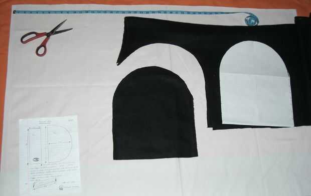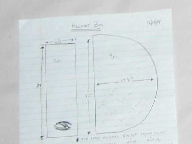 La plantilla para los lados del casco era de 12 pulgadas. de ancho y 14 pulgadas largo en el punto más largo y que curva a 4-6 pulgadas hacia abajo de los lados de los peces. La segunda pieza fue el material naranja y la circunferencia del centro del casco, 37 X 6 en. La tercera pieza del "ajuste" era 2 1/2 pulgadas ancho X 37 largo.