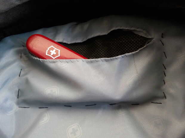 Quiero llevar mi navaja suiza en mí y tienen fácil acceso, pero no quiero que se amplia abierta en público en caso hace una persona nerviosa. Generalmente lo guardo en mi mochila, pero buscando en el fondo de mi bolsa para conseguirlo es un dolor en el trasero y demasiado lento. Quiero acceso fácil a mi herramienta, manteniendo escondido. Así que he creado un bolsillo escondido en mi mochila justo debajo del borde de la cremallera.