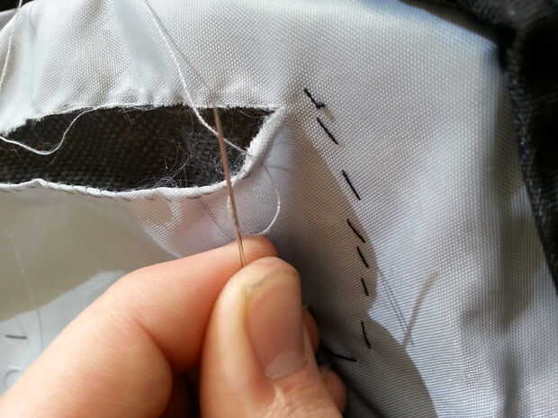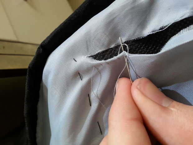 Usé un tipo diferente de puntada para mantenerlo hacia abajo. No sé cómo se llama, por lo que no puedo recomendar fuentes externas para ayudar. Lo que hice es meter la aguja a través, pase el hilo a través de y luego ponerla sobre la parte superior y empuje a través. Las fotos de arriba pueden ayudar. Entonces ate lo con la misma técnica que antes (ahora tengo fotos de referencia).
