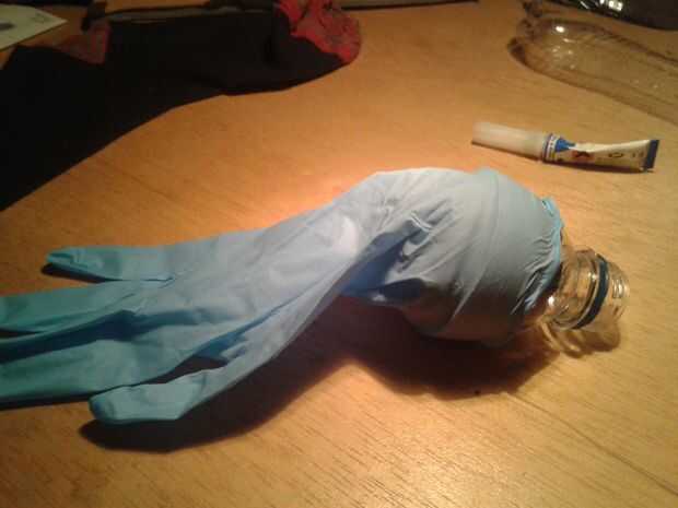 para asegurar la bolsa es impermeable y no se estropeen las biodegradables de bolas, hacemos una capa con un guante de examen médico, ojo, no sea de los van empolvados. Lo pegamos al embudo de plástico.