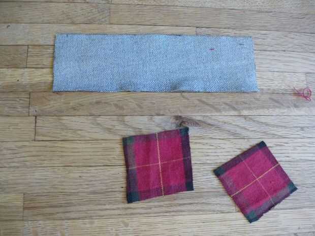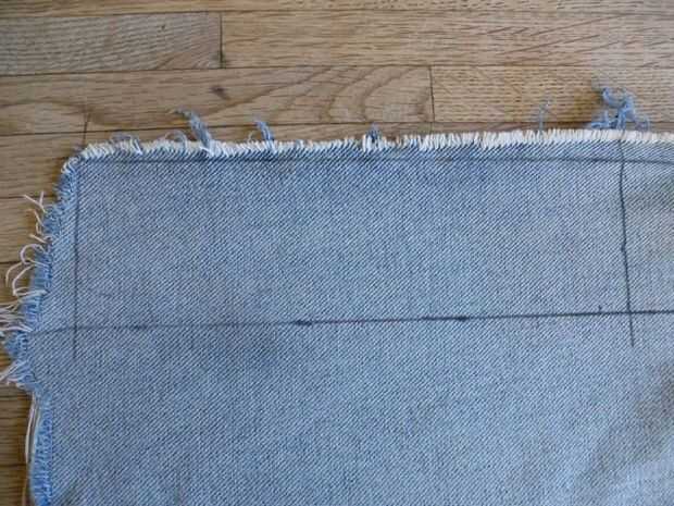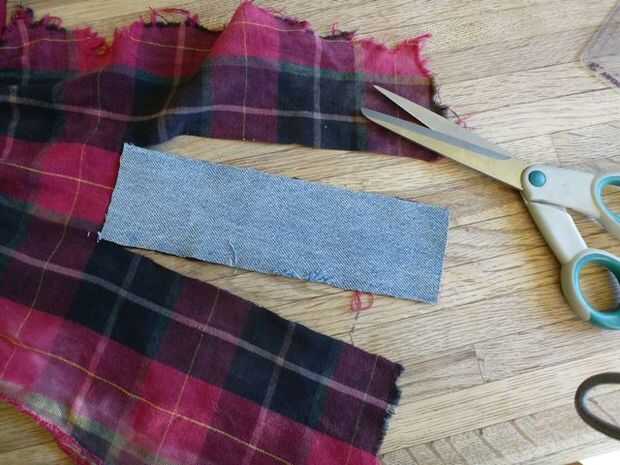 Una vez que corta la franja envolvente hacia fuera, usted puede utilizar a medida para sus pequeñas plazas.  Primero corte un pedazo largo con el ancho de tu banda como guía, girar a la franja de 90 grados para cortar la pieza larga en cuadrados.   Normalmente utilizo algo colorido para las plazas finales para hacer la bolsa se vea bonito (este sistema usa un material de un viejo par de pantalones de pijama) pero también se puede utilizar más denim.