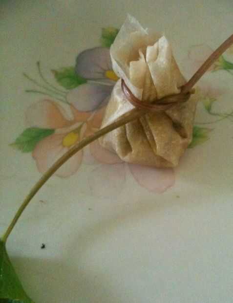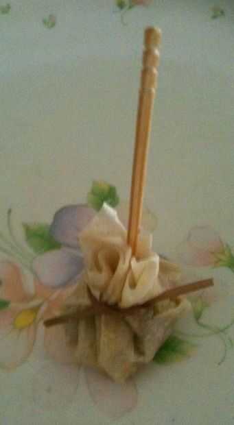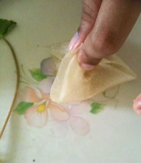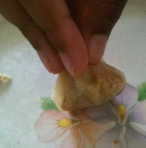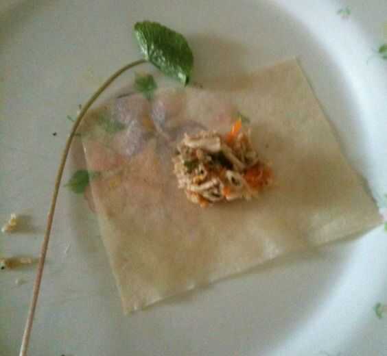 cortar pequeños cuadrados de la hoja de rollo de primavera. colocar parte del relleno en el centro. la elevación de todos los rincones y hacer una bolsa... atar con un tallo de una hierba o hierba de limón. Ahora pega un palillo y freír. Es así de simple!