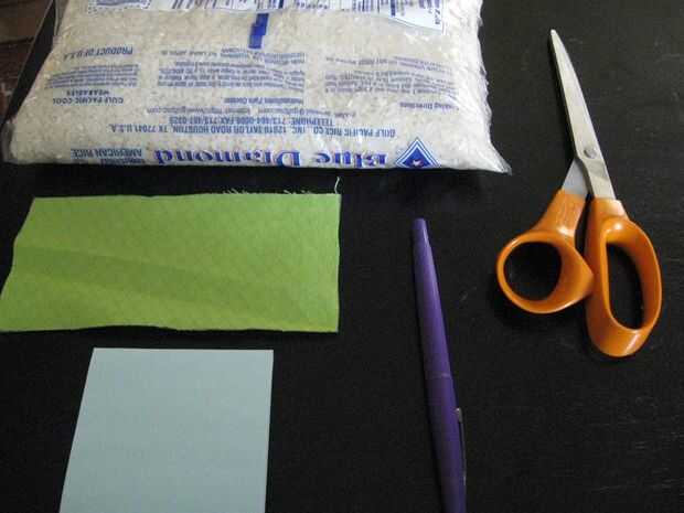 Los materiales necesarios son la tela, elegí un algodón robusto de la papelera de restos. Tuve la suerte de encontrar a una tela de color brillante con una textura ligera que dará una gran sensación para malabares. Para una plantilla usé una nota adhesiva 3 x 3. Un rotulador, tijeras y arroz para el relleno son los elementos restantes. También usé un lápiz y un embudo que no se muestra. La tela estaba en venta y recogí una yarda por $2. La bolsa de arroz era un variet barato de $1,20. Calculo que puedo hacer cerca de 20 bolsas con esta cantidad o un juego y un par de cenas.