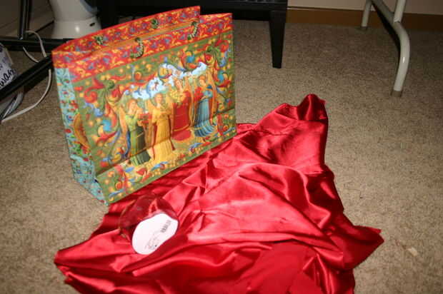 ½ patio material de satén rojo Bolsa de papel 14" W X 10" L Máquina de coser, hilo, tijeras, rojo con cable cinta (2 yardas), hierro, imperdible, elástico (media yarda).