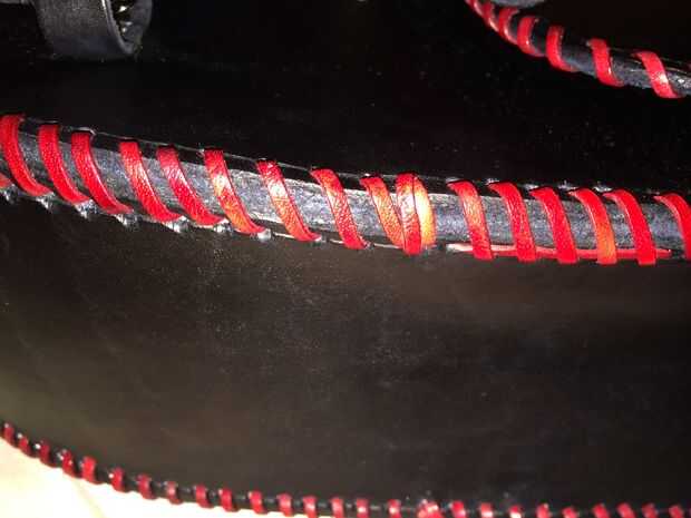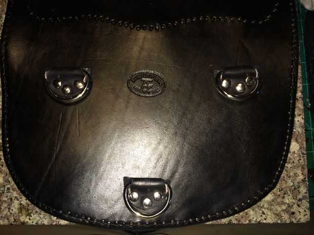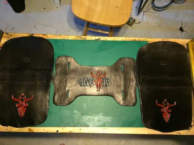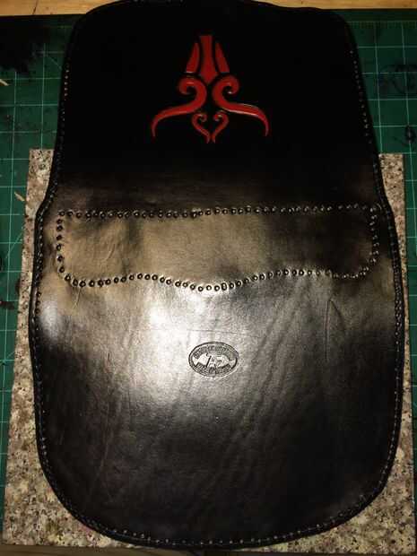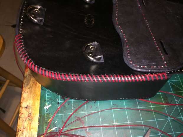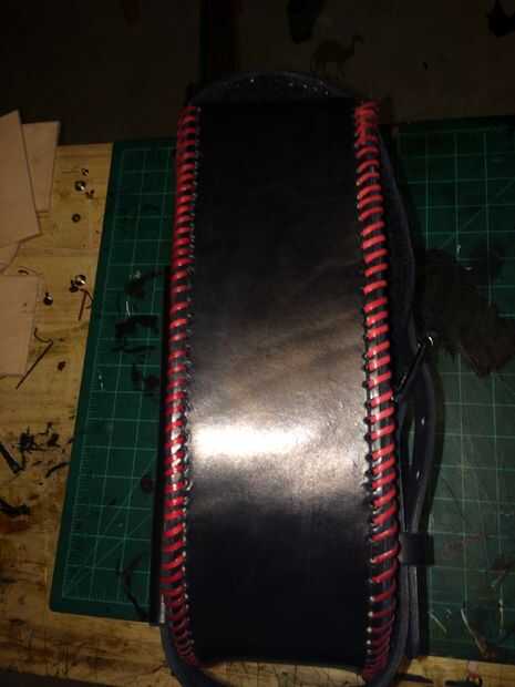 Una vez que los paneles se cortan, fileteado, perforado, teñido y pintado es el momento para llevarlo todo junto. Lo primero que hace es coser la parte trasera de la correa trasera con cualquier diseño o diseño que usted utilice. Usted puede clavar o unirlas. Personalmente prefiero mano cose con hilo de nylon encerado trenzado en un ocho porque es el punto más fuerte en el mundo una máquina no puede reproducirlo. los remaches pueden oxidarse, pero aparte de eso son robusto si se fijan bien. Después de paso a continuación, coser el panel de refuerzo a la parte trasera. No olvide asegurarse de que sus orificios se alineen correctamente, pero si tienes un poco extra en un extremo no duele nada. Si el fuelle no es suficiente entonces vendrá corto y es donde las cosas comienzan a mirar un poco chiflado. Siempre asegúrese de que su línea de paneles de refuerzo los paneles delantero y trasero. Me gusta mi refuerzos a los paneles de encaje. Puedes comprar encaje de cuero teñido de un color determinado o se mancha de cualquier color que te gusta. Fui con el rojo debido al tema el cliente incorporado en su logotipo. Utilicé una puntada del azote técnica del cordón, pero hay varios estilos de cordón que se puede lograr. Voy a hacer algunos instructables de ésos también. Si usted desea establecer Dee anillos en la parte trasera como un medio de asegurar a la estructura de la moto ahora es el momento de hacerlo. Recordando a medida que aceleras a 80 en la carretera como ir volando la parte de atrás de la moto y en un 18 ruedas no va a hacerle ningún bien. Yo era tú y bastante ingenuos alforjas en aquel momento. nunca más. No esperes a instalarlos después de recibir la parte delantera con cordones encima de. perforación de taladros y remaches de ajuste no es fácil dentro de una bolsa atada para arriba.