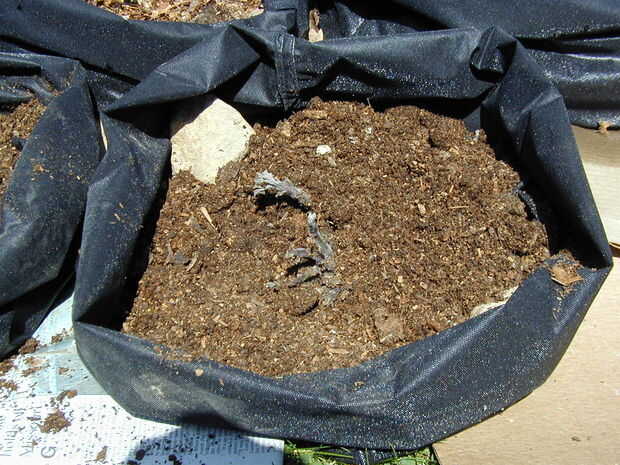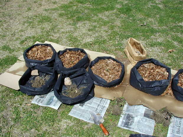 Coloque una piedra o dos en la parte inferior de las bolsas a pesar abajo. Coloque una capa de mantillo en la parte inferior de las bolsas para cubrir las copas. Mantillo puede ser cualquier cosa que usted tiene un montón de como: rallado hojas o papel, heno, paja, serrín, etc..