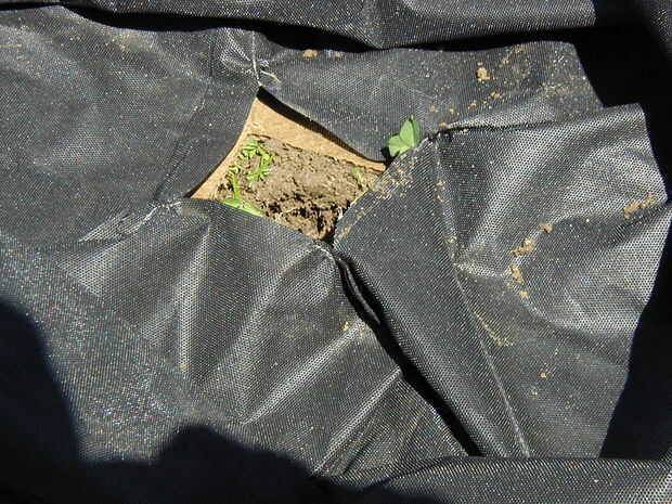 Baje los lados de tus bolsas de Tater hasta formar una bolsa poco profunda. Coloque las bolsas sobre los agujeros en el papel. Cavar hoyos muy superficiales en el suelo para plantar la patata de semilla y cubrir ligeramente con tierra y compost.