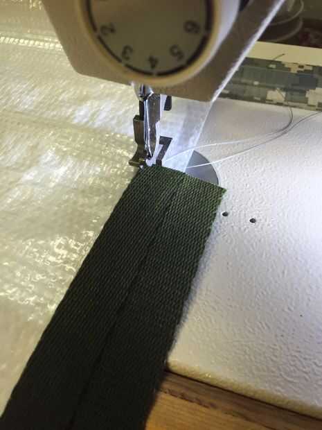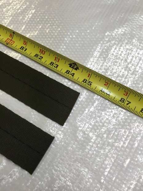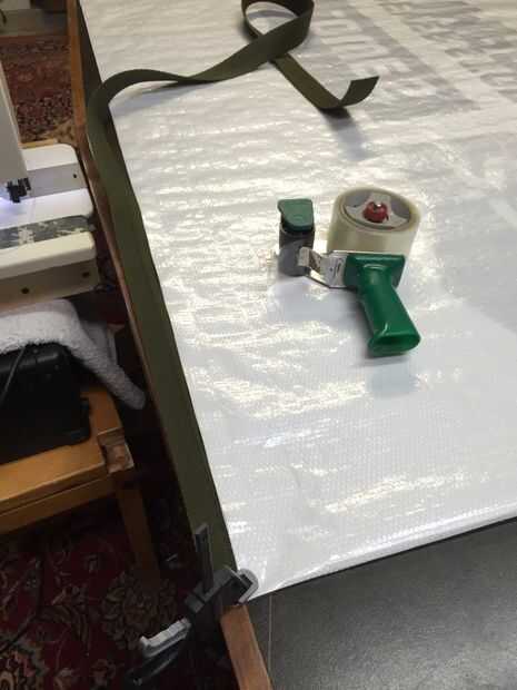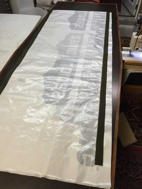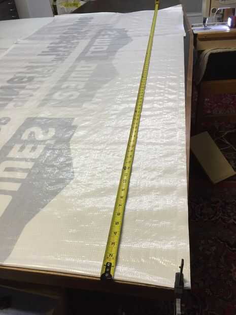 La longitud de la envoltura es de 85"(frente y espalda además de aleta). La anchura es de 64" doblado para hacer un tubo o saco en el que la espuma de célula cerrada desliza dentro. Corte la envoltura, doblar y coser la cinta en un lado. Que la mitad de las correas de la caída de lados de la bolsa para facilitar la costura final. Utilice cinta para mantener materiales en lugar de coser. Medir la dimensión interior (entre correas) en el 31", marca, cinta y coser las correas. La anchura del bolso terminado medirá alrededor 29" entre las correas, otra vez debido a la pérdida.