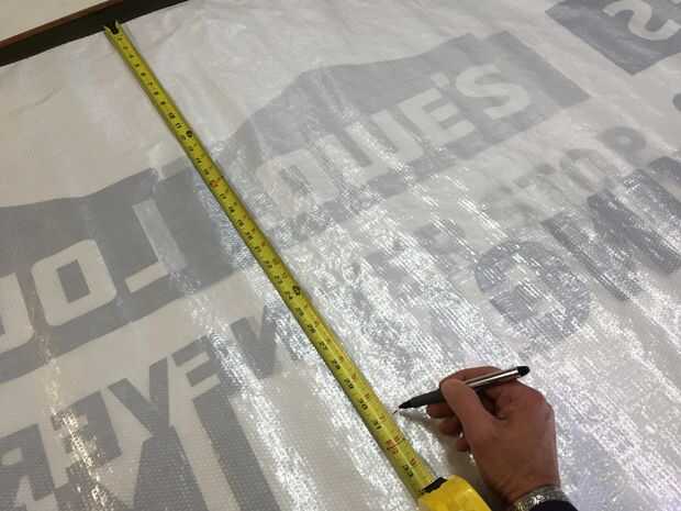 Mida el abrigo de la casa, doble la longitud necesaria para el frente y la parte posterior del marco, más extra para una aleta. Esta aleta es alrededor 10" abarcan dos obras de arte enmarcadas, gancho y lazo ficha, además de compensación por la pérdida de tamaño interior en curva debido a la espuma de la célula de media pulgada cerrado interior.