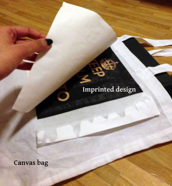 Deje que se enfríe el diseño 2-3 minutos. Después de esto, lentamente pele apagado el forro del papel de transferencia, después de que podrá ver su diseño impreso en la bolsa.