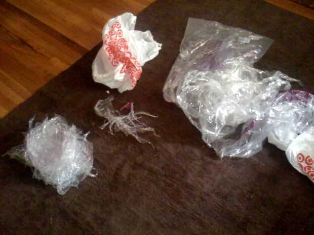 Rasgó los bolsos gigantes en mitad-rasgando las costuras para hacer una lámina de plástico gigante (otro resultado posible: lonas?). Luego arrancó que en las tiras que rasgado por la mitad.