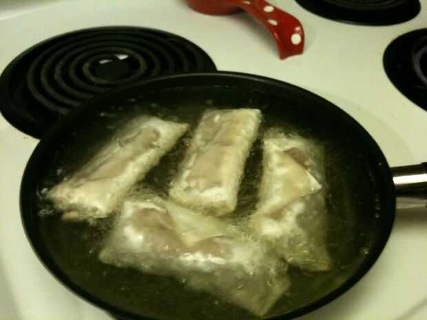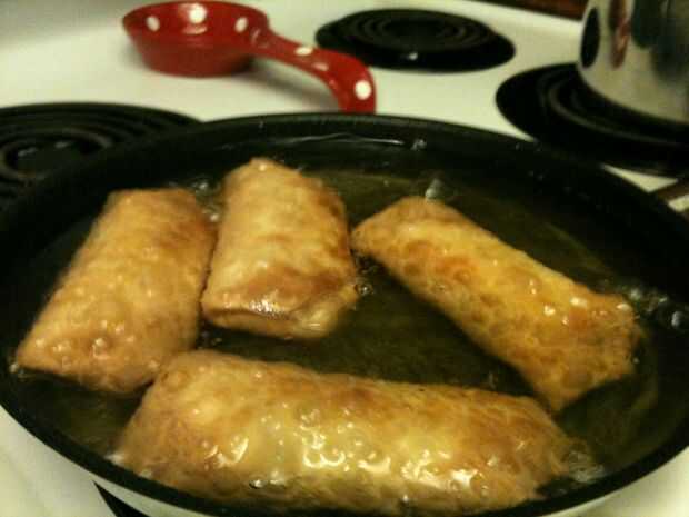 OK, ahora que el aceite esté caliente (otra vez, no haga demasiado calor, o las envolturas saldrá chiclosos) suavemente Coloque los rollos en la bandeja uno a la vez tratando de evitar las salpicaduras de aceite!