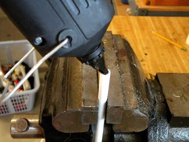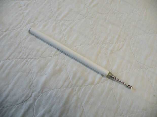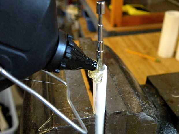 Ahora vamos a pegar la antena dentro del cuerpo de la pluma. En primer lugar, el soporte del cuerpo de la pluma verticalmente en una abrazadera con el extremo abierto hacia arriba o vice. En segundo lugar, inyectar algún pegamento caliente en el tubo y rápidamente introducir la antena en el tubo. A continuación, poner pegamento caliente adicional en la abertura del tubo para asegurar que la antena está bien sujeto en su lugar. Por último, deshacerse de todos aquellos extremadamente molesto pegamento caliente telarañas.