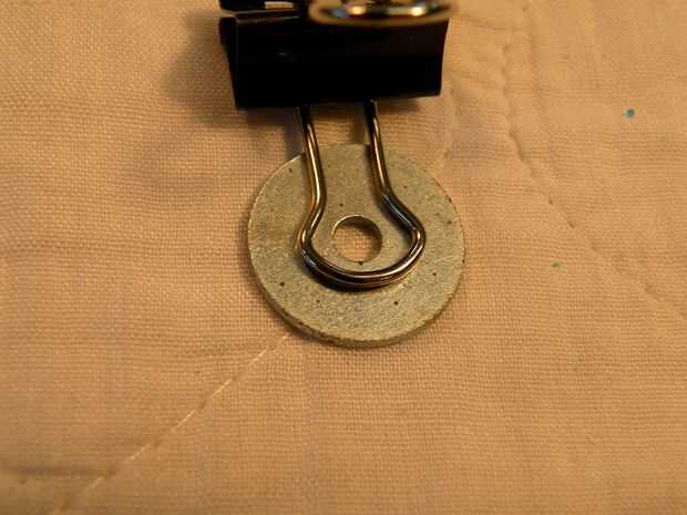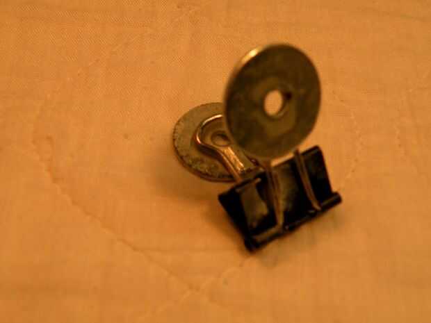 En primer lugar, conseguir el clip binder y dos de las arandelas medianas. Coloque una de las arandelas en una mesa y coloque el clip binder sobre él de modo que el agujero de la arandela se centra en la parte superior más ancha del clip binder. Utilizar pegamento o pegamento caliente para unir estos dos pedazos juntos. Una vez que el pegamento se haya secado, repita este procedimiento en el lado opuesto del clip binder.