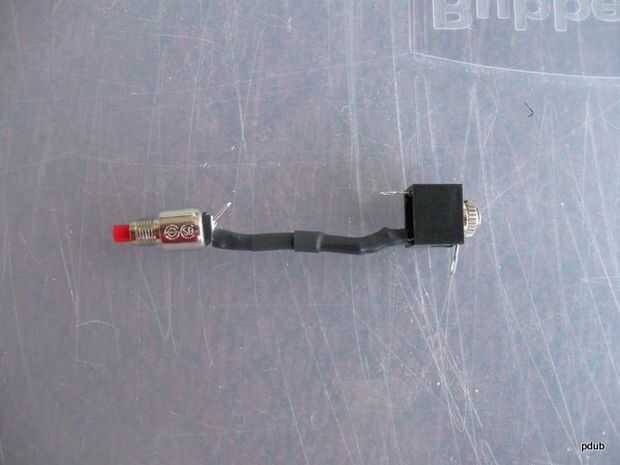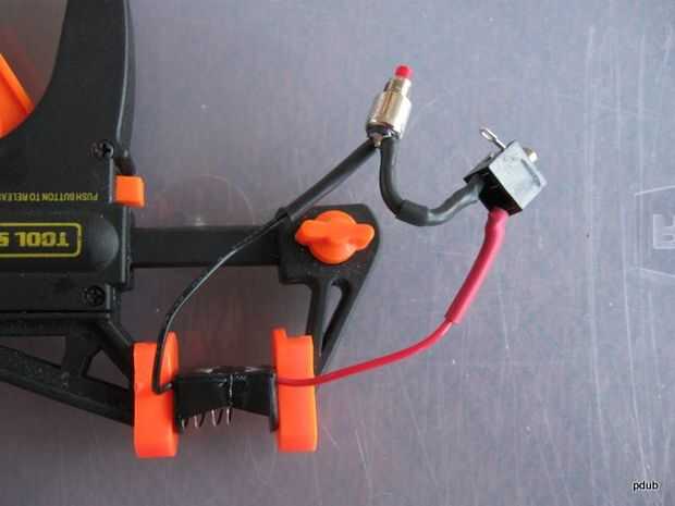 Comenzó a construir el circuito soldando un cable entre el conector de 3/32" y el interruptor momentáneo. Después de que el pegamento en mi soporte de la batería modificada había secado lo suficiente como para trabajar y observando la polaridad, sueldan sus cables a los terminales no utilizados del gato y el interruptor para completar el circuito. Utilizar tubería encogible para cubrir todas las juntas de soldadura.