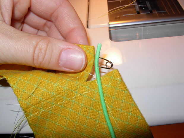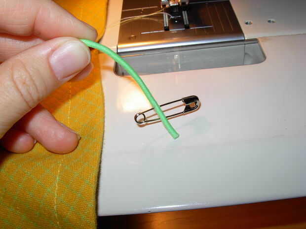 Foto 3, 4, 5, 6, 7: usando un alfiler en el extremo de la cuerda elástica, pase el cable por el tubo que acaba de crear.