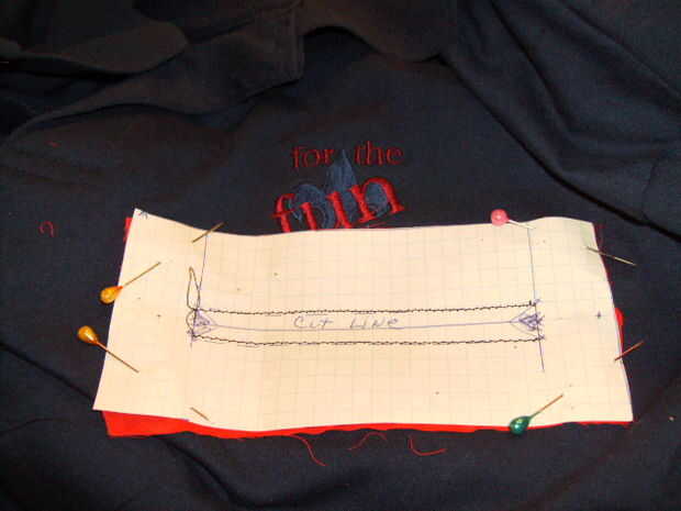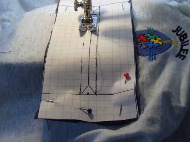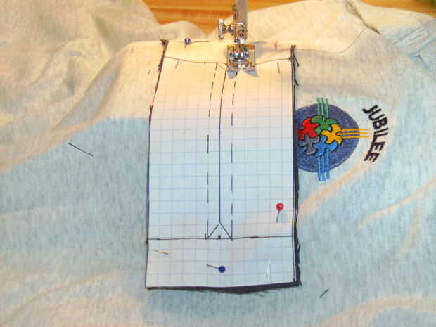 Pin el patrón y la tela en las cuatro esquinas a la camisa, cose a través en el patrón (la línea punteada) que se encuentra en ambos lados de la línea central. No dio vuelta la camisa para coser la segunda línea, porque no quiero mover el mundo fuera de línea, así que moví la camisa el riesgo de volver a hacer la segunda línea y luego coser. Funciona bien.