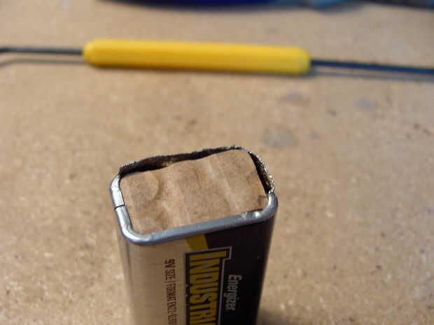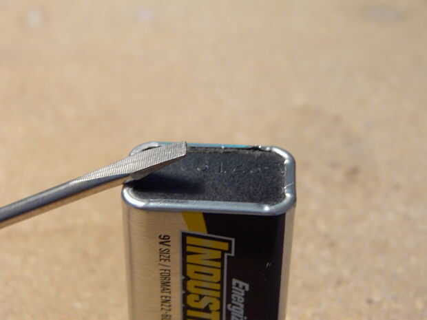 Usar un par de cortadores de alambre para ayudar a tire hacia arriba el extremo de la carcasa de metal no terminal, a continuación, utilice su cabeza plana Destornillador para doblar el resto del extremo para arriba así que usted puede quitar el cartón final y el contenido de la batería