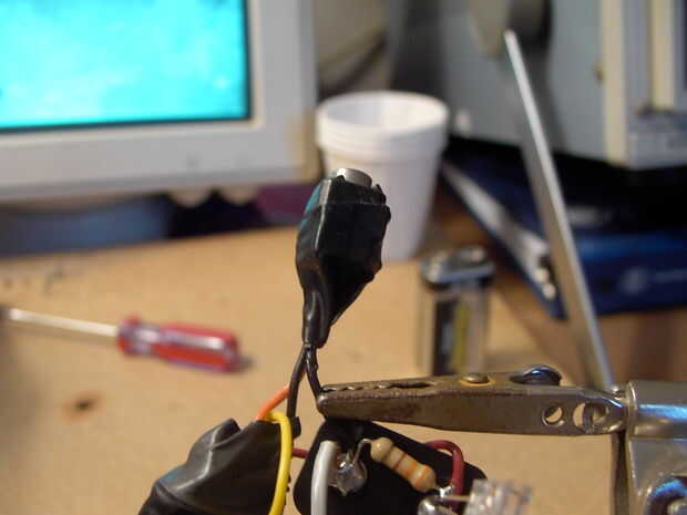 Finalmente envolver todo en cinta eléctrica, esto no tiene que ser agua apretado, pero lo suficientemente donde cuando nos inundan el caso con el epoxy no se llena en los auriculares.