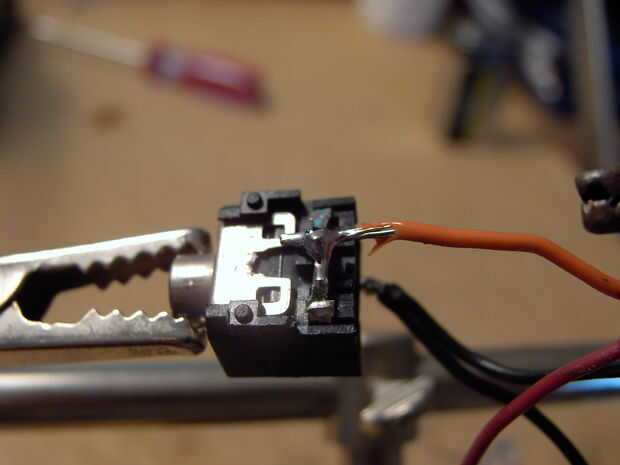 Junto con la pieza a cortar, pelar aproximadamente 1/4 pulgada en el extremo y espiral trasero para el cable común, básicamente empalmar el cable que sólo recortar, luego soldar el pigtail a la tierra en su salida de auriculares. Este gato (como la mayoría) tiene la tierra envuelta alrededor del exterior del gato, opté por la soldadura de la conexión a tierra en la parte superior el gato y el clip del conector de tierra.