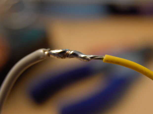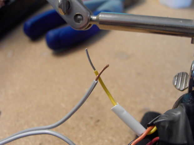 Deslizarse sobre una pulgada de tubo del encogimiento del calor 5mm sobre un alambre y salir de soldadura soldadura y giro empalmar los 2 cables con una línea en forma de calor.