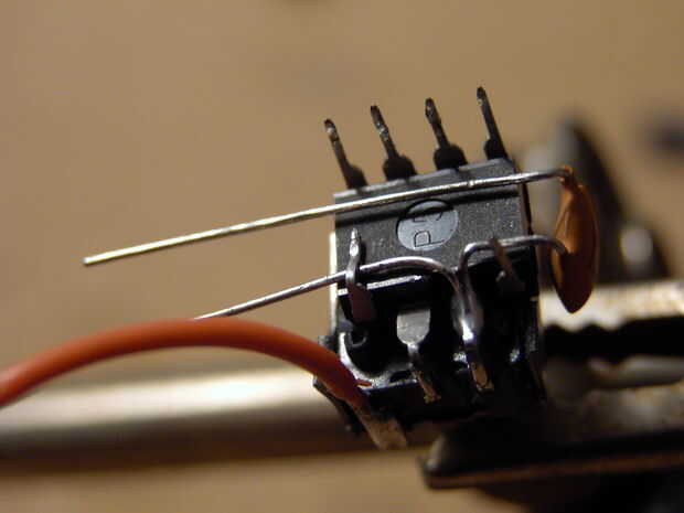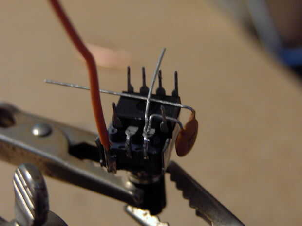 Finalmente doble pin 4 del chip sobre el plomo restante en el vientre de la viruta, luego de la soldadura y el exceso de clip
