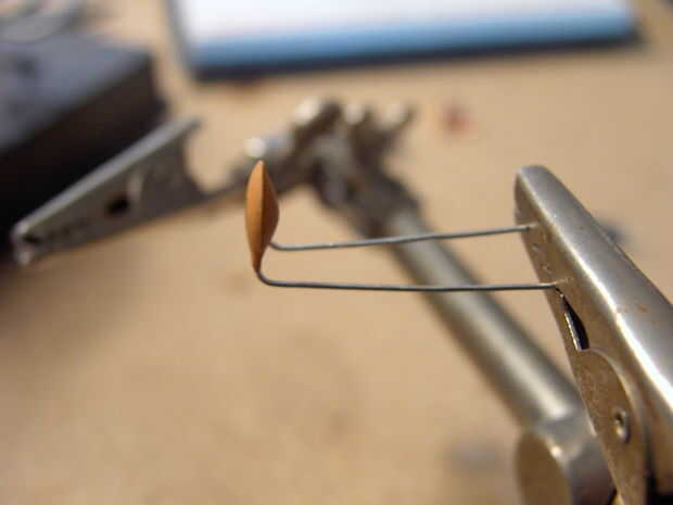 Primero tomar su aguja alicates de la nariz y mantenga la tapa lleva en ellos tan cerca de la base como sea posible sin agrietarse la capa exterior, a continuación, dobla la tapa hacia arriba en un ángulo de 90 grados.