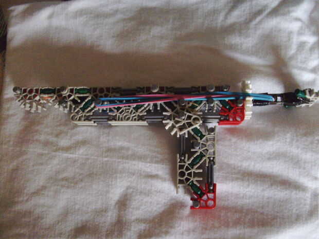 Descripción: se trata de una pistola de alta potencia KVG que cabe en el bolsillo frontal media. Tiene muy buena precisión sobre una gama larga pero dispara alto por lo que necesitará apuntar bajo. es aproximadamente el mismo tamaño como KILLERK de pistola pero es (debatebly) más potente y puede fuego cualquier varilla de tamaño (trabajo de varillas amarillas mejor) y puede incluso fuego de ramas de árboles, reír a carcajadas. La pistola es muy robusta y el percutor es difícil de eliminar de la parte posterior por lo que es menos probable que se desconectase accidentalmente durante el armado. Disparo, el gatillo se gira hacia la derecha para disparar. Utiliza una parte de corte para el gatillo (la mitad una barra verde) y cinta adhesiva en la cocción tirar barra. Utiliza leña elásticos, un elástico de gatillo y tres elásticos para mantener tres barras blancas en para la estabilidad adicional.