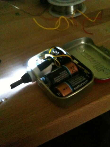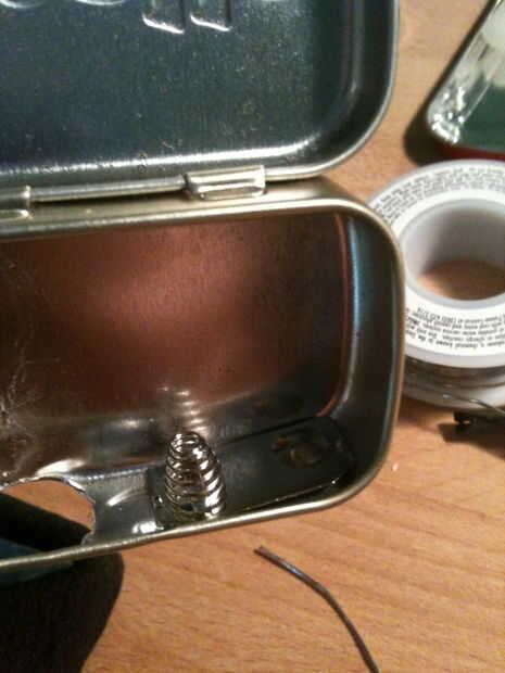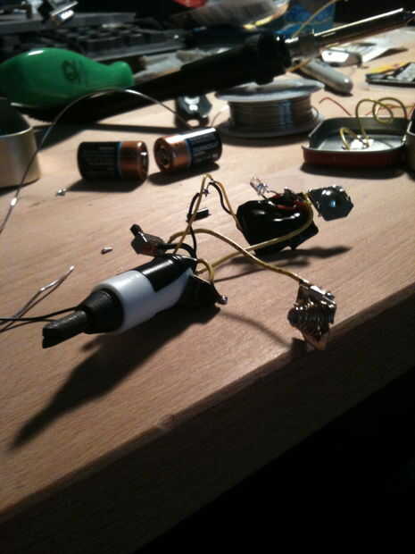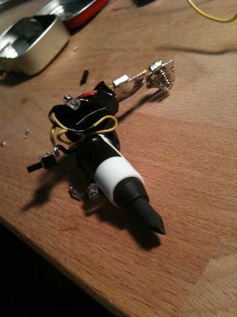 Vuelva a colocar el alambre terminal central del interruptor con un cable más largo y coloque esto en el terminal (con muelle) negativo de la batería. Cubre todo el metal expuesto con cinta aislante, cinta del LED blanco (cerca de la punta) hasta la punta para que la luz brilla a través del orificio en el caso de la punta y cubre la placa de circuito con cinta. Conecte el LED rojo a la platina de cinta cubierto y esas cosas todo en el caso como se muestra a continuación. Puede que necesite de la cinta o el interruptor en su lugar dependiendo de cómo funcionó la instalación de epoxy. Es posible usar sólo la cinta y la fricción de los cables, pero use adhesivo si usted está buscando una solución más permanente.