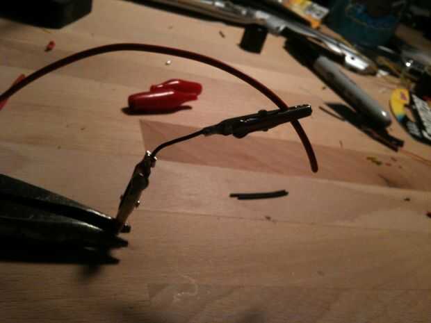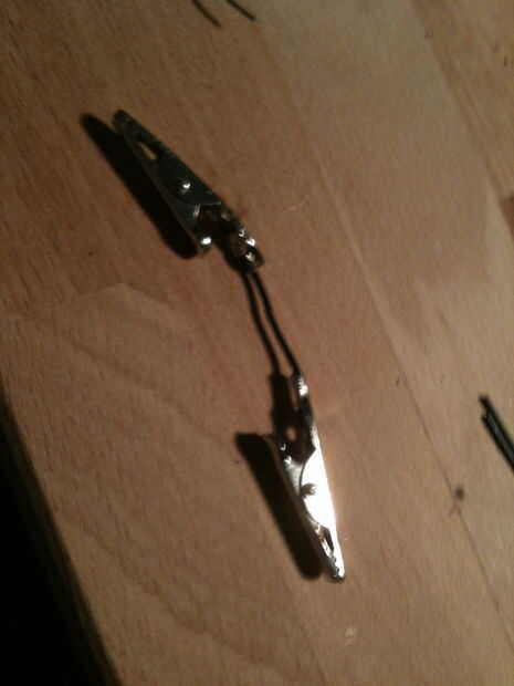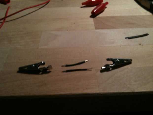 Este es un paso simple. Tomar una perfectamente buena Cocodrilo clip cable de conexión, quite las pinzas del cable descartar el cable, retire las cubiertas de los ganchos y una longitud corta de cable de núcleo sólido cada clip para actuar como un apoyo pero flexible conector entre los clips de la soldadura.