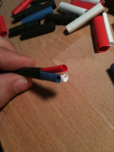 Tome una longitud de un diámetro más grande (. 25") HST y tres largos de pequeño diámetro (. 125") HST e insertar las tres longitudes de tubo pequeño en el tubo grande. Corte a esta Asamblea en tiras de la anchura de la caja (bisagra al lado desquiciado) y ponerlos a un lado. Puede hacer referencia a este paso para crear más paquetes de HST en cualquier momento.