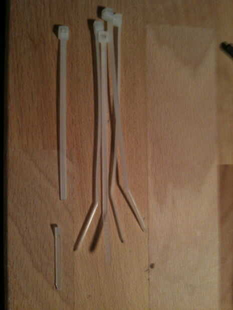 Reunir cinco a diez 5" bridas y recorte los extremos de donde la sección nervada cumple con la sección lisa. Colóquelas al lado.
