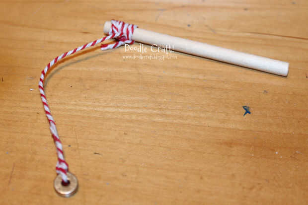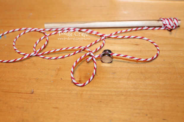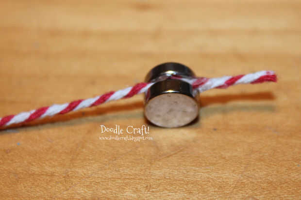 Poner un poco de pegamento caliente en uno de los imanes y poner la cuerda en él.
